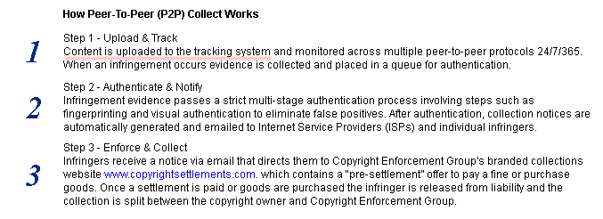 Mike Meier employs the same “experts” as Ira Siegel – Copyright Enforcement Group (actually, Meier’s Copyright Law Group is listed as a partner) — the company that admits uploading copyrighted material to p2p networks in order to entrap file-sharers: