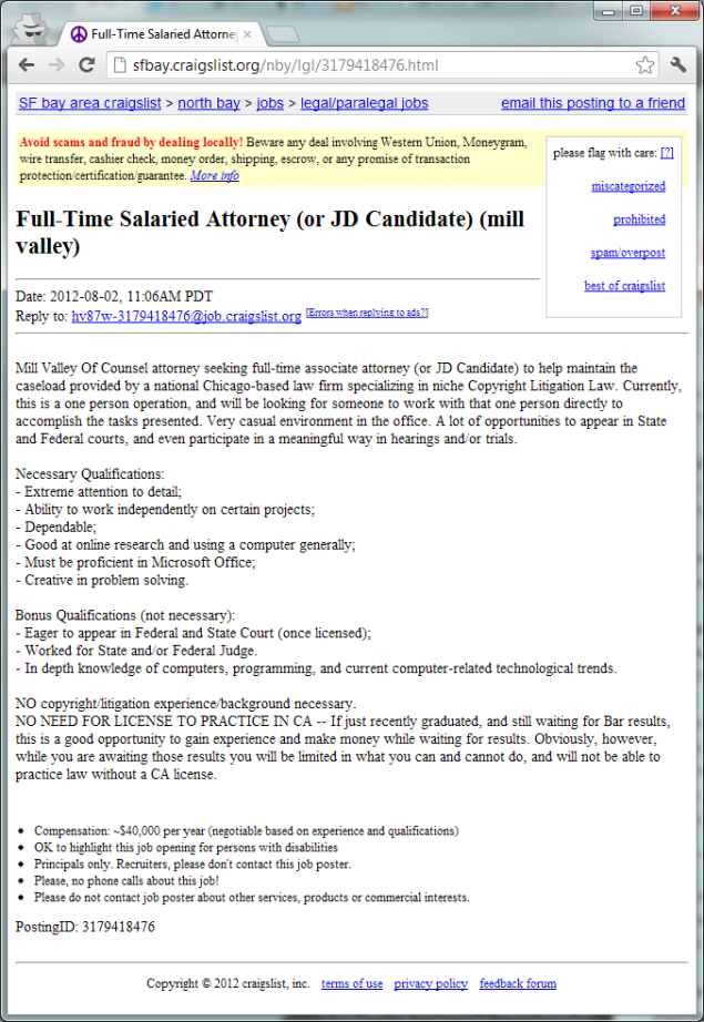 3. Craigslist? How appropriate. It’s on the same site people use to find prostitutes and used furniture. Salary of $40,000? Wow, way to scrape the bottom of the bottom of the barrel, Gibbs. I knew the job market for JDs is bad but is it THAT bad? Glad I decided to go the MBA/CPA route…I still wish that I’d have taken that job with the IRS so I could flag Prenda for an audit so thorough that it’s the financial audit equivalent of a cavity search.