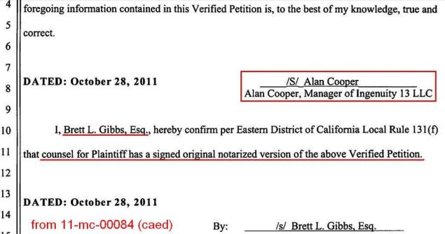 Today DieTrollDie posted an update about yesterday’s dismissal: Brett Gibbs dismissed Ingenuity 13 v. John Doe (CACD 12-cv-08333) pending before Judge Wright. I tweeted about it chuckling at the fact that a miserable attorney couldn’t avoid whining even in a dismissal notice… and forgot about it — until I was pointed to the fact that this is the same case where Judge Wright granted Morgan Pietz’s discovery that supposed to shed some light on the mysterious AF Holdings / Ingenuity 13 CEO Alan Cooper.