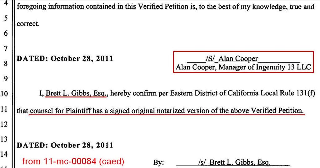 […]I confirmed the existence of the client-executed verification either by seeing a copy of the signed verification, or at the very least, being informed by a representative of S&H or Prenda that a signed verification was in the possession of S & H or Prenda.