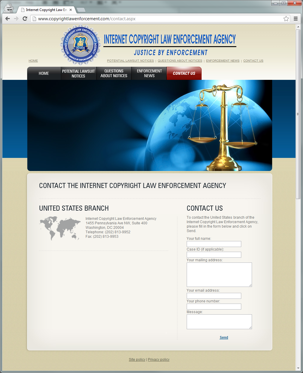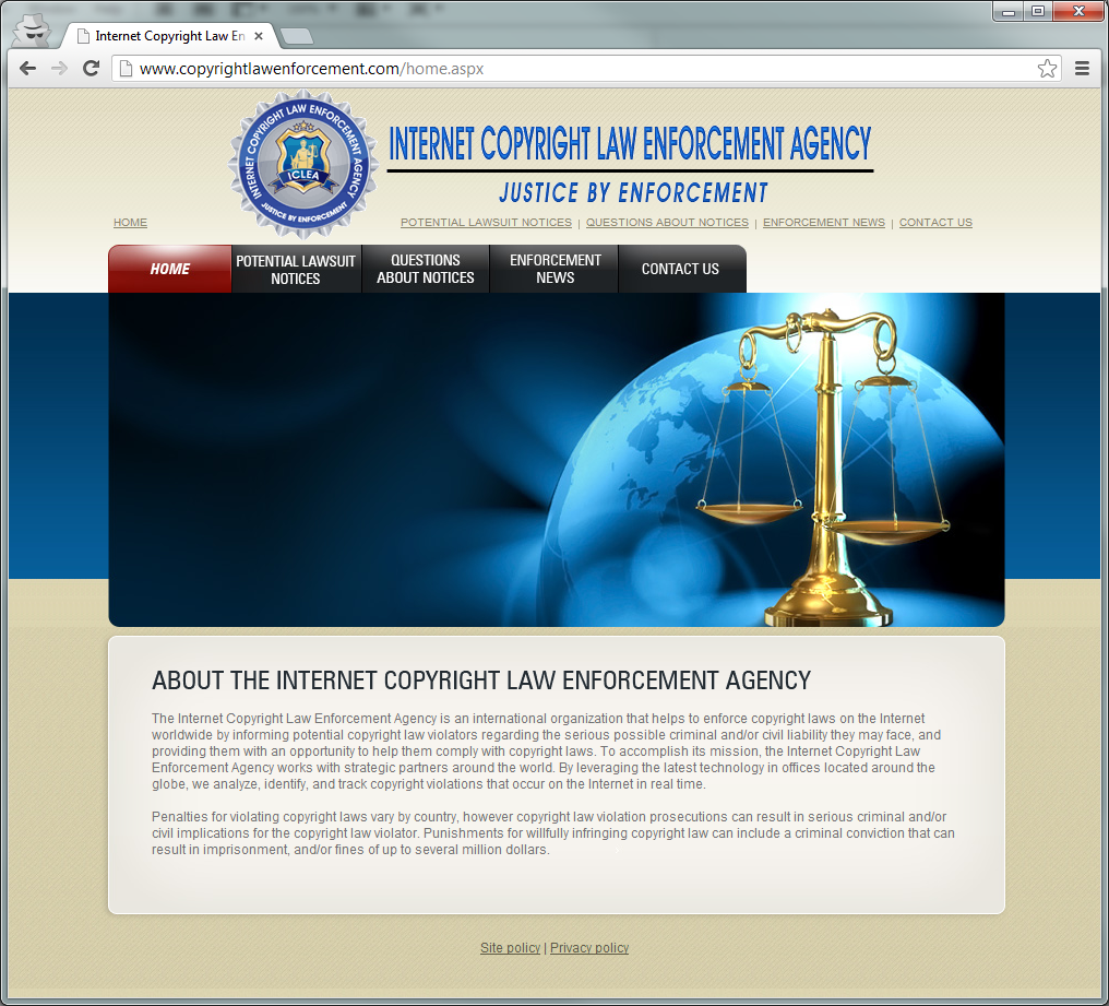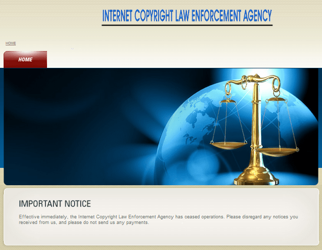 Thanks to Mike Masnick and others for alerting me about the apparent shutdown of the fraudulent operation. Currently the website of the “Internet Copyright Law Enforcement Agency” looks like this: