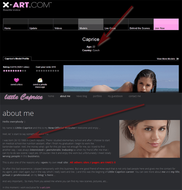 One of the top X-Art’s models is Marketa Stroblova, a.k.a Little Caprice. X-Art claims she is 22, while Marketa herself states on her very own website:
