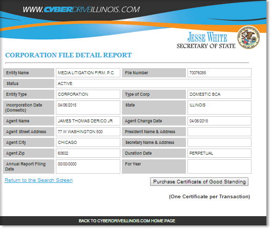 “Media Litigation Firm,” yet another beast’s head, was registered by a Chicago attorney James T. Derico, Jr. of Derico & Associates, P.C. on 4/06/2015 using his firm’s address. I have no idea how this attorney is related to the shakedown cartel. Time will tell.