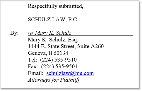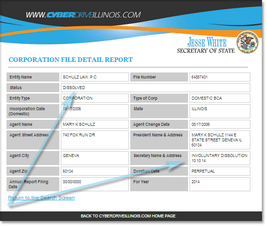 There is one small problem with it. According to the Illinois Secretary of State portal, “Schulz Law, P.C.” was involuntarily dissolved on 10/10/2014: