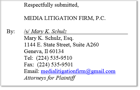 I just found out that the involuntarily dissolution problem is now moot as Ms. Schulz started filing using a new entity in her signature block, “Media Litigation Firm”: