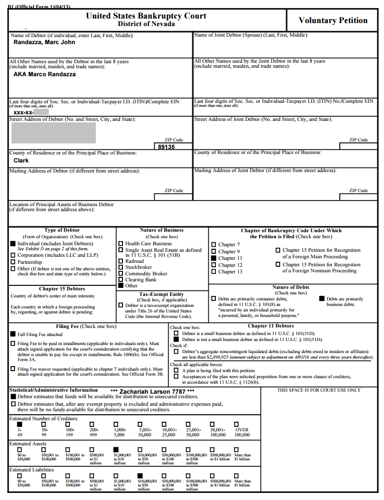 On 8/28/2015 Marc Randazza filed a Chapter 11 bankruptcy petition. He listed 1-10 million as estimated assets and 10-50 million as estimated liabilities (that’s why Chapter 13 is not an option). As a result, the Clark County case (a petition to confirm the arbitration award) was automatically stayed / administratively closed. This situation is tricky: Randazza essentially declared that the arbitration is so burdensome that bankruptcy is the only choice. However, he implied it before the said arbitration was finalized, and the bankruptcy is seemingly aimed at preventing the finalization. So expect Liberty to continue pushing for the final arbitration decision (moving to resume the closed case).